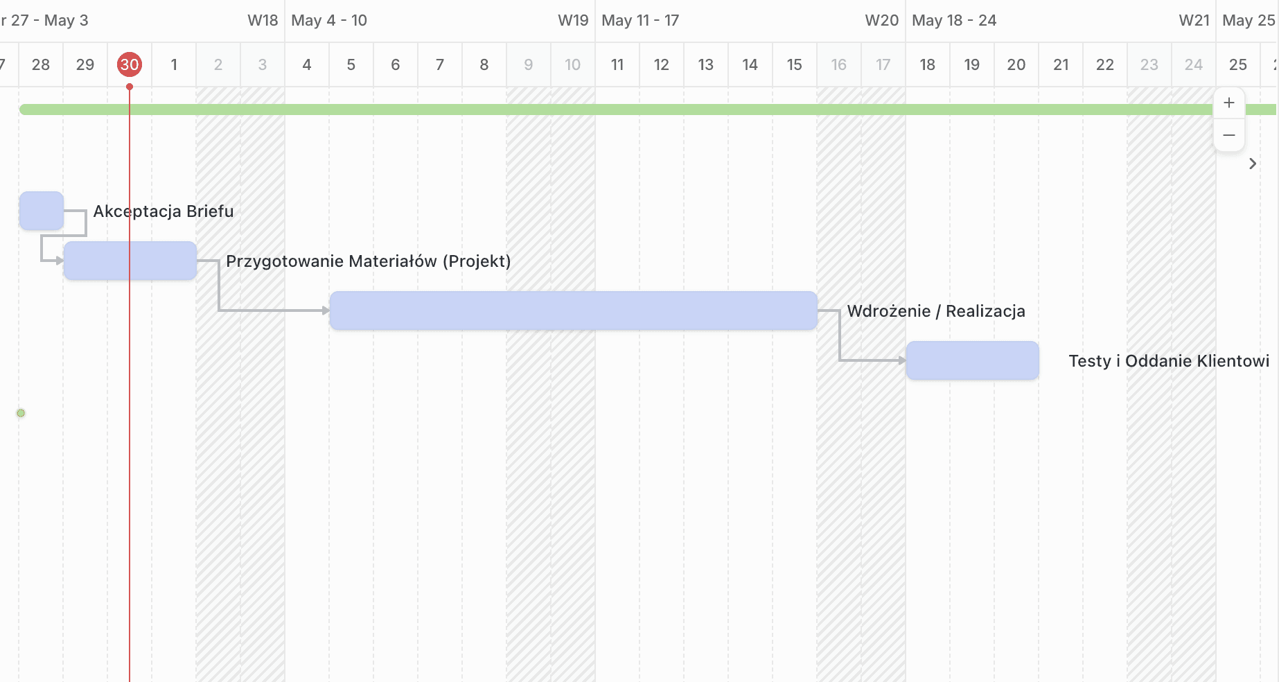 Zespół pracuje na ułożonych kaskadowo checklistach. Klient zwleka z akceptacją? Przesuwasz datę jednego zadania na osi czasu, a cała reszta projektu automatycznie przelicza i dostosowuje swój harmonogram.